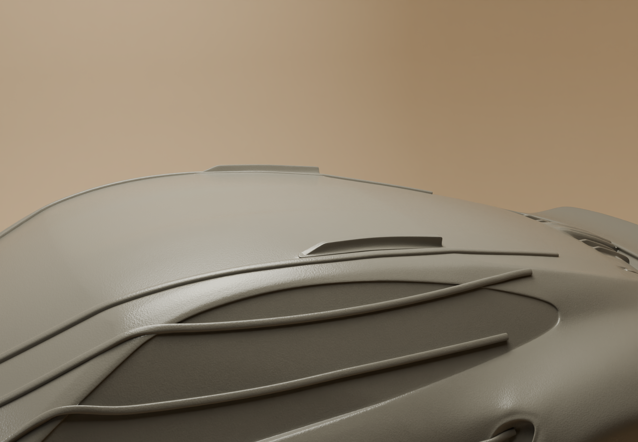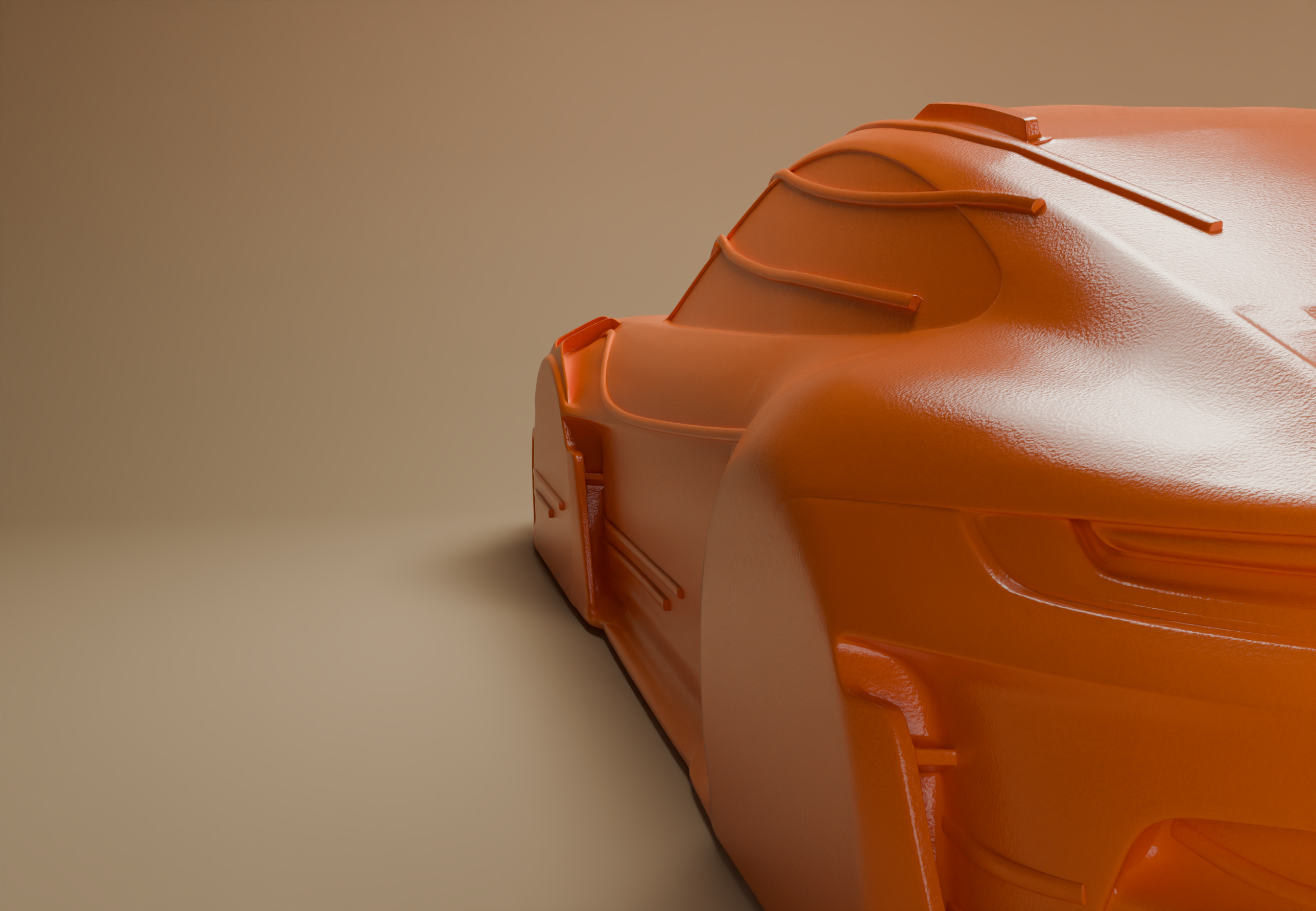 Mein Ziel mit dieser Skulptur: Aerodynamische Ingenieurskunst betonen. Zu oft wird sich stark auf den Spoiler konzentriert. Die aerodynamischen Maßnahmen am gesamten Auto, die den Spoiler erst funktionieren lassen, werden dabei vernachlässigt. Deshalb ist der Spoiler bewusst weggelassen. Aerodynamische Bauteile an der Front werden bewusst gezeigt. Die Linien zeigen den Verlauf der Luft und geben der statischen Skulptur Dynamik. Durch das Verlaufen der Linien am Heck betone ich mein künstlerisches Ziel, den Fokus auf die Aerodynamik in der Front zu legen, zusätzlich.
